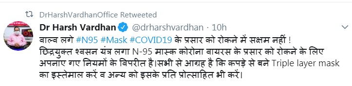 एक ट्वीट में स्वास्थ्य मंत्री ने लोगों से अपील की कि वे कपड़े से बने तीन परतों वाले मॉस्क का इस्तेमाल करें और दूसरे लोगों को भी ऐसा करने की सलाह दें।