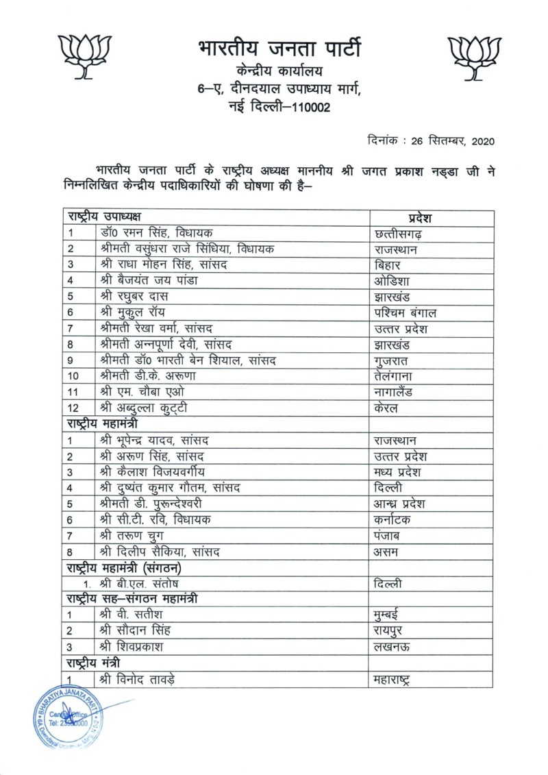 भाजपा द्वारा जारी नये पदाधिकारियों की सूची यहाँ देखें :