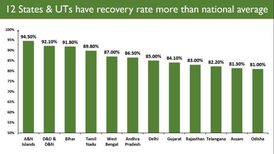 12 राज्यों और केन्द्र शासित प्रदेशों में रिकवरी रेट राष्ट्रीय औसत से अधिक दर्ज किया गया है।