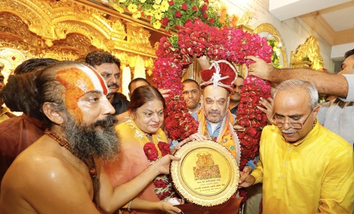 भाजपा के राष्ट्रीय अध्यक्ष अमित शाह 14 जुलाई,2018 को रथ यात्रा के अवसर पर मंगला आरती के दर्शन के दौरान अहमदाबाद में जगन्नाथ मंदिर में श्रद्धा अर्पित करते हुए।