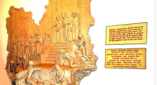 सतना जिले के चित्रकूट में रामदर्शन प्रदर्शनी । इस प्रदर्शनी में रामायण के विविध प्रसंगों पर आधारित भित्ती चित्रों और चित्रमय झांकियों को दर्शाया गया है। इस भित्ती चित्र में भगवान श्री राम बलात्कार से पीड़ित बालाओं को सांत्वना देते हुए कह रहे हैं कि अब राक्षस मुझसे बच नहीं…
