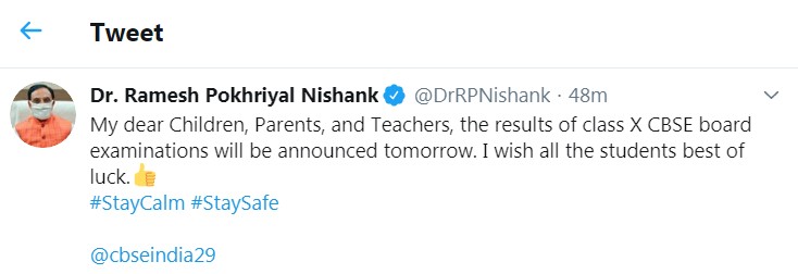 “मेरे प्यारे बच्चों, अभिभावकों और शिक्षकों, दसवीं कक्षा की सीबीएसई बोर्ड परीक्षाओं के परिणाम (CBSE Result) कल घोषित किए जाएंगे। मैं सभी छात्रों को शुभकामनाएं देता हूं। # StayCalm #StaySafe, “मानव संसाधन विकास मंत्री ने एक ट्वीट में कहा।