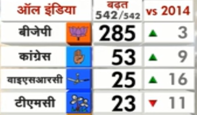 542 लोकसभा सीटों की वोटों की गिनती चल रही है। दोपहर एक बजे तक 285 भाजपा सीटों पर आगे चल रही है।।