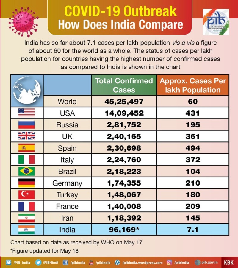 कोरोनावायरस (COVID-19) के फैलाव और प्रकोप (outbreak) के संदर्भ में भारत (India) और कुछ देशों (some other countries) की तुलना (compare) देखें :