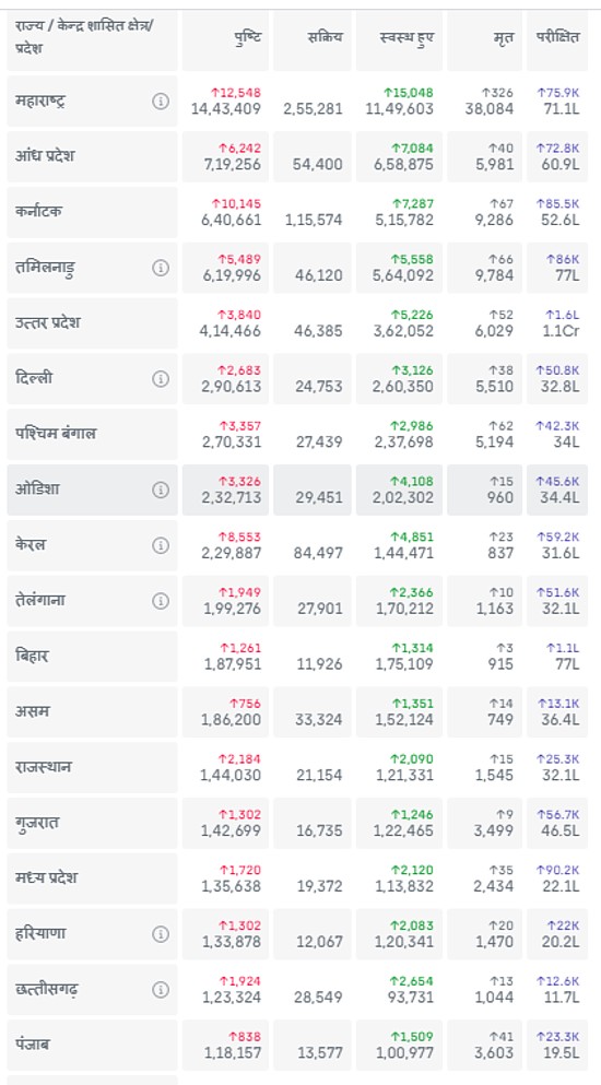 भारत में एक लाख से अधिक कोरोना (COVID-190 संक्रमित मामलों वाले राज्यों की सूची नीचे दी जा रर्ही है :