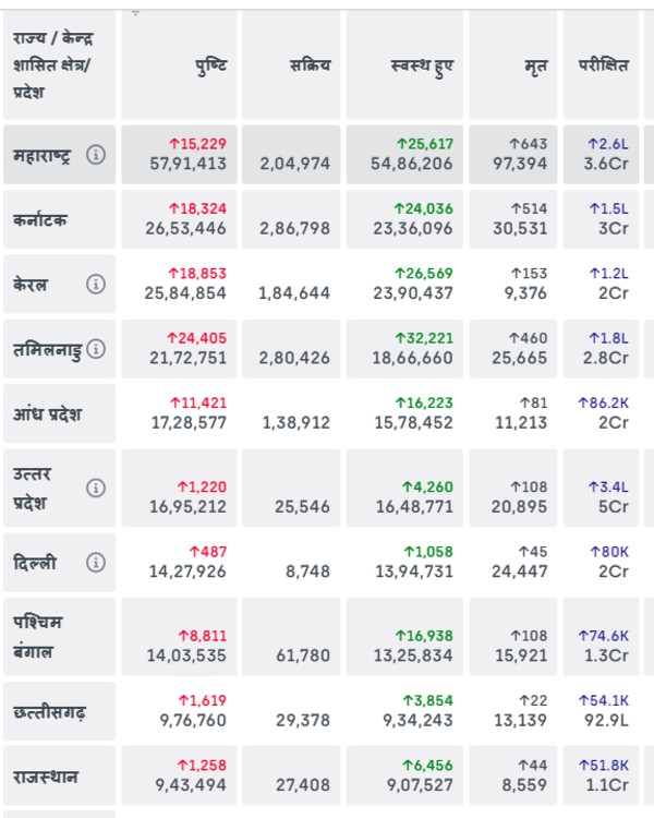 कोरोना (covid-19) से मौत के मामले अभी भी महाराष्ट्र (Maharashtra) में ही हैं किन्तु नए मामले तेजी से घट रहे हैं और बीते 24 घंटे में 15,229 लोग ही संक्रमित पाए गए हैं। बीते 24 घंटे में मरने वालों की संख्या 643 रही है। महाराष्ट्र में अब तक कोरोनावायरस से 97,394 लोग मारे जा चुके हैं और कुल 57,91,465 लोग कोरोना से संक्रमित हो चुके हैं। महाराष्ट्र में इस समय सक्रिय मामले 2,04,974 हैं।
