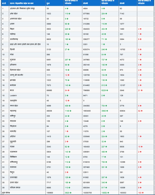 नीचे कोरोना के संबंध में राज्यवार तालिका दी जा रही है: