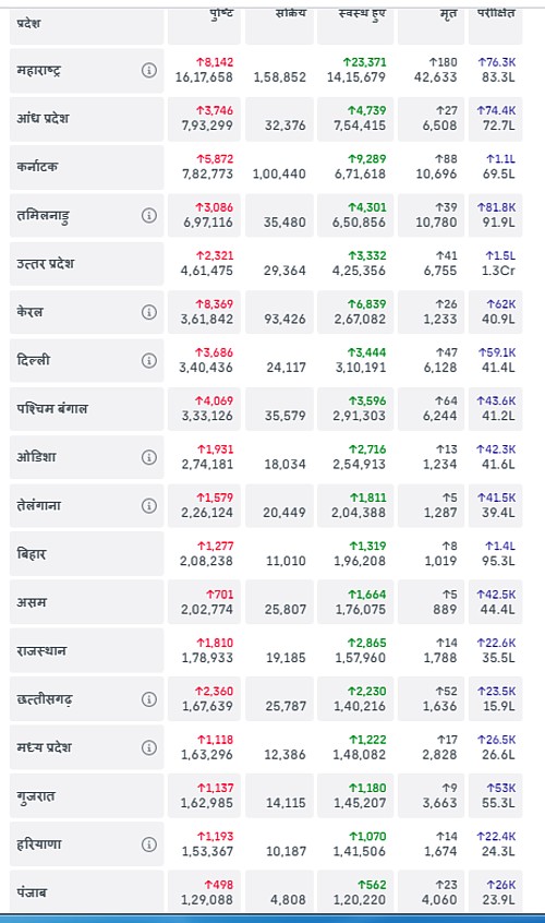 करीना के मामलों में सबसे बड़ी गिरावट महाराष्ट्र में आई है वहां बीते 24 घंटों में 8142 लोग संक्रमित पाए गए हैं और कुल संक्रमितों की संख्या महाराष्ट्र में 1617658 होगई है।
