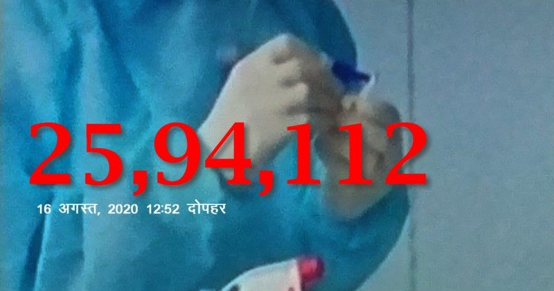 रविवार , 16 अगस्त को दोपहर 12:52 बजे स्वास्थ्य मंत्रालय द्वारा जारी आंकड़ों के अनुसार देश में कोविद-19(COVID-19) के पुष्ट मामलों की संख्या 25 लाख 94 हज़ार 112 हो गई है ।