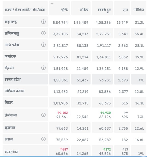 स्वास्थ्य मंत्रालय द्वारा रविवार 16 अगस्त दोपहर 12ः52 बजे जारी आँकड़ों के अनुसार कोरोना संक्रमण वाले कुछ राज्य इस प्रकार हैं: