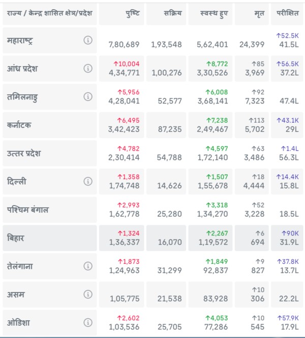 31 अगस्त रात 08ः48 बजे जारी आँकड़ों के अनुसार एक लाख से अधिक कोरोना (COVID-19) संक्रमित वाले राज्य हैं :