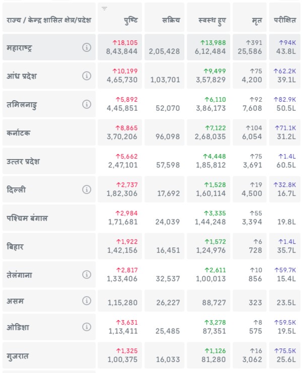 हमेशा की तरह महाराष्ट्र में कोरोना (COVID-19) के सबसे अधिक मामले हैं वहां 843844 लोग कोरोनावायरस से संक्रमित हो चुके हैं। कोरोना से आज संक्रमित होने वालों की संख्या वहां 18,105 है।