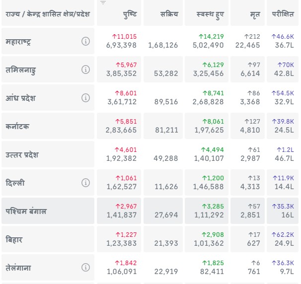 एक लाख से अधिक संक्रमित होने वाले राज्यों की सूची इस प्रकार है: