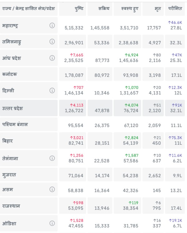 महाराष्ट्र में हालांकि 3,51,710 लोग ठीक हो गए हैं और 1,45,558 अपना इलाज करा रहे हैं। इस राज्य में अब तक 17,757 लोगों की कोरोना (COVID-19) के कारण मौत हो गई है।