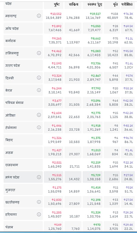 अब राज्यवार आंकड़ों की बात करें तो पहले स्थान पर महाराष्ट्र बना हुआ है वहां अब तक 15,54,389 लोग संक्रमित हो चुके हैं जबकि आंध्र प्रदेश में यह संख्या 7,67,465 और कर्नाटक में 7,36,371 है।