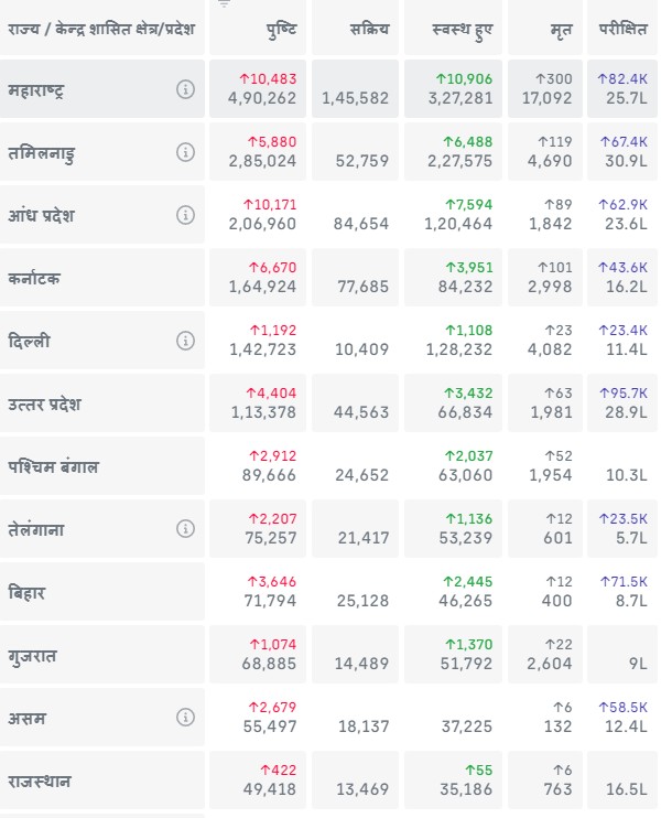 कोरोनावायरस (Coronavirus) के सबसे अधिक 4,90,262 मामले महाराष्ट्र से हैं ।
