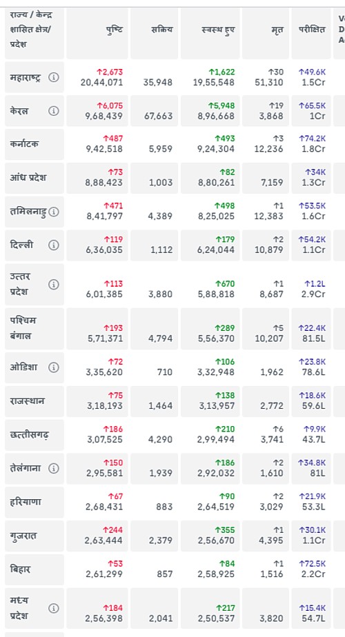 नीचे की तालिका में भारत के कुछ राज्यों की ताज़ा स्थिति देखें :