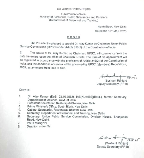नई दिल्ली, 14 मई । राष्ट्रपति द्रौपदीमुर्मू ने डॉ. अजय कुमार को संघ लोक सेवा आयोग का अध्यक्ष नियुक्त किया।