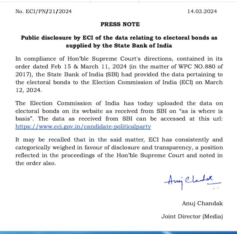 भारतीय चुनाव आयोग ने कहा है कि आज अपनी वेबसाइट पर चुनावी बांड पर एसबीआई से प्राप्त डेटा “जैसा है जहां है” के आधार पर अपलोड किया है।