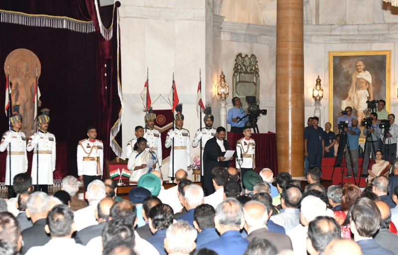 न्यायमूर्ति भूषण रामकृष्ण गवई भारत के 52वें मुख्य न्यायाधीश के रूप में शपथ लेते हुए। राष्ट्रपति द्रोपदी मुर्मू ने आज 14 मई को उन्हें शपथ दिलाई।