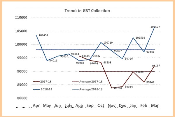 मार्च 2019 में जीएसटी संग्रह GST collection एक लाख छह हजार करोड़ रुपये पार कर गया। यह वित्त वर्ष 2018-19 में उच्चतम संग्रह है।