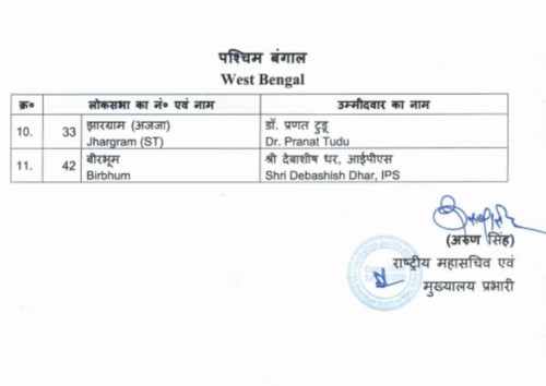 पश्चिम बंगाल की बीरभूम लोकसभा सीट से देबाशीष धर और झाड़ग्राम सीट से प्रणथ टुडू को उम्मीदवार बनाया गया है।