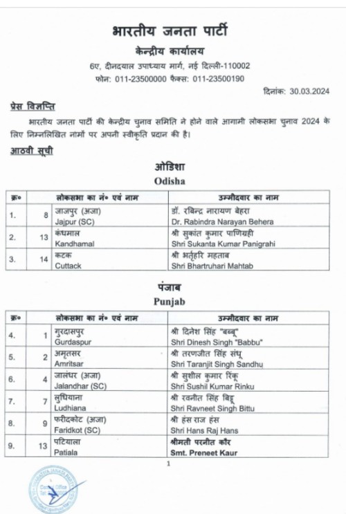 नई दिल्ली, 30 मार्च। लोकसभा चुनाव 2024 के लिए बीजेपी ने अपने उम्मीदवारों की आठवीं सूची जारी कर दी है। इस सूची की खास बात यह है कि इस बार बीजेपी ने हंसराज हंस को दिल्ली की बजाय पंजाब के फरीदकोट से मैदान में उतारा है।