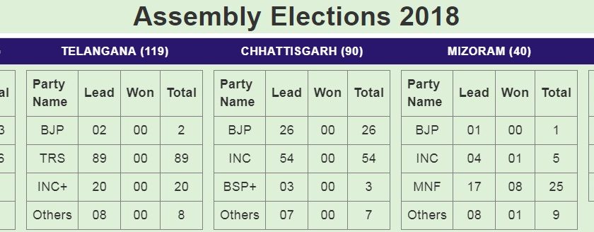 दोपहर 2ः15 बजे तक प्राप्त समाचारों के अनुसार छत्तीसगढ़ में कांग्रेस स्पष्ट रूप से सरकार बनाने जा रही है हालांकि वोटों की गिनती अभी भी जारी है वहीं राजस्थान में कांग्रेस की सरकार बनने की संभावना स्पष्ट है लेकिन अभी वोटों की गिनती वह भी चल रही है मध्यप्रदेश में कांटे की टक्कर है।