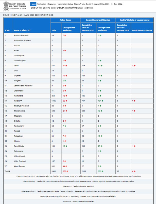 नई दिल्ली, 02 जून – भारत में कोविड-19 के मामलों में एक बार फिर से बढ़ोतरी दर्ज की गई है। स्वास्थ्य एवं परिवार कल्याण मंत्रालय (MoHFW) द्वारा जारी ताज़ा आंकड़ों के अनुसार, देश में सक्रिय मामलों की कुल संख्या बढ़कर 3961 हो गई है। इसमें सबसे अधिक 1435 मामले केरल से सामने आए हैं, जो किसी भी राज्य से सबसे अधिक हैं। वहीं, महाराष्ट्र में 506 सक्रिय मामलों के साथ यह दूसरे स्थान पर है।