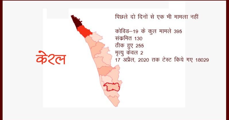 अब तक केरल में कोरोनावायरस संक्रमण के कुल 395 मामलों की पुष्टि हुई है और 138 मरीज़ों का फ़िलहाल राज्य भर के विभिन्न अस्पतालों में इलाज चल रहा है। अब तक ठीक हो चुके लोगों की संख्या 255 है।
