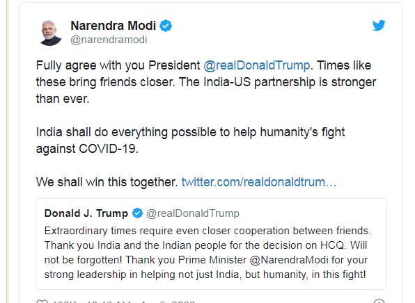 प्रधानमंत्री नरेन्द्र मोदी ने अमेरिका के राष्ट्रपति के ट्वीट का जवाब देते हुए कहा, ‘इस तरह का अप्रत्याशित समय मित्रों को और करीब ला देता है। भारत-अमेरिका साझेदारी ( (India-US partnership) ) पहले की तुलना में निश्चित तौर पर अब कहीं ज्यादा मजबूत है।