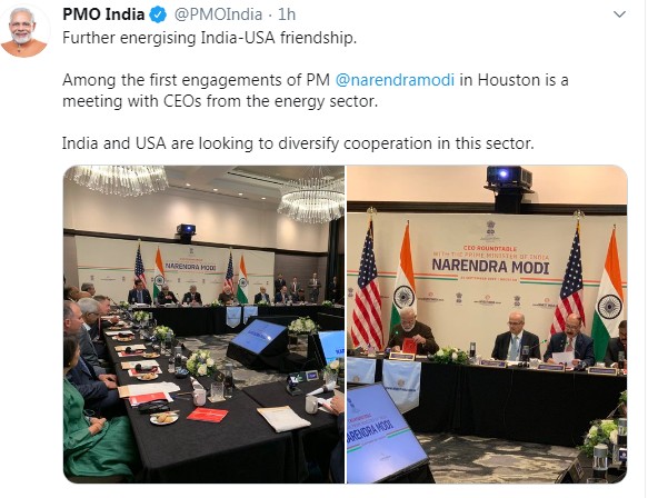 प्रधान मंत्री नरेंद्र मोदी का अमरीका के ह्यूस्टन (Houston)में पहला कार्यक्रम ऊर्जा क्षेत्र के मुख्य कार्यकारी अधिकारियों के साथ बैठक करना है।