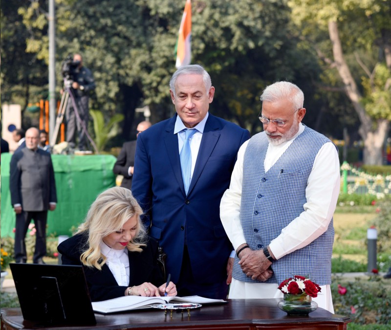 इज़रायल के प्रधानमंत्री बेन्जामिन नेतन्याहू की पत्नी सारा नेतन्याहू 14 जनवरी, 2018 को तीन मूर्ति चौक, नई दिल्ली में आगंतुक पुस्तक में हस्ताक्षर करते हुए। इस अवसर पर प्रधानमंत्री नरेन्द्र मोदी भी दिख रहे हैं।