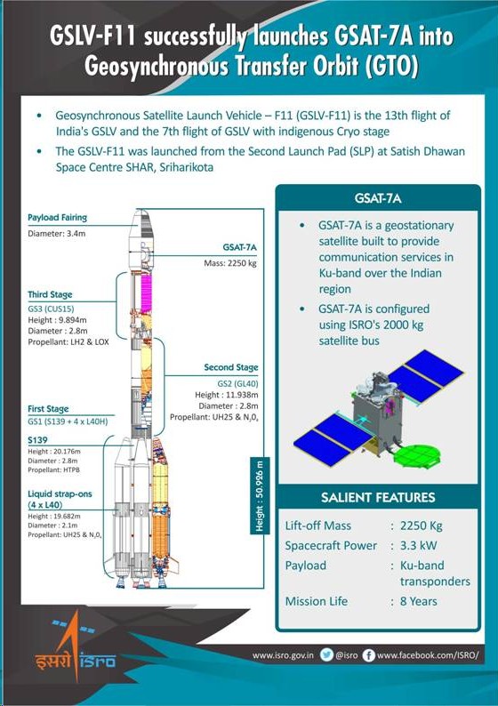 सतीश धवन अंतरिक्ष केंद्र (एसडीएससी), श्रीहरिकोटा से बुधवार को भारतीय अंतरिक्ष अनुसंधान संगठन (इसरो) के जियोसिनक्रोनस सेटेलाइट लांच व्हेकिल (जीएसएलवी-एफ 11) ने सफलतापूर्वक जीसैट-7ए को लांच कर दिया।