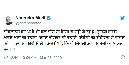 मोदी ने एक ट्वीट में लोगों से राज्य और केंद्र सरकारों द्वारा दिए जा रहे निर्देशों का सख्ती से पालन करते हुए अपने परिवार के सदस्यों और खुद को बचाने की अपील की।