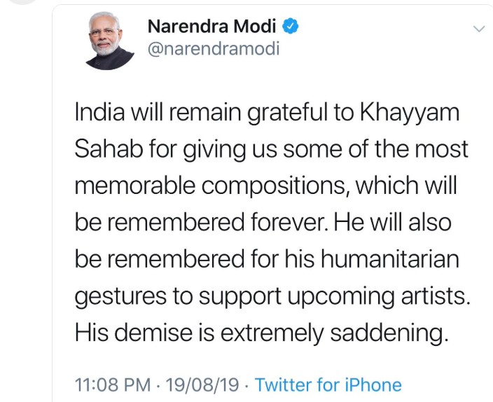 प्रधानमंत्री नरेन्द्र मोदी ने ट्वीट करके शोक व्यक्त किया और संगीत के क्षेत्र में उनके योगदान का स्मरण किया है।
