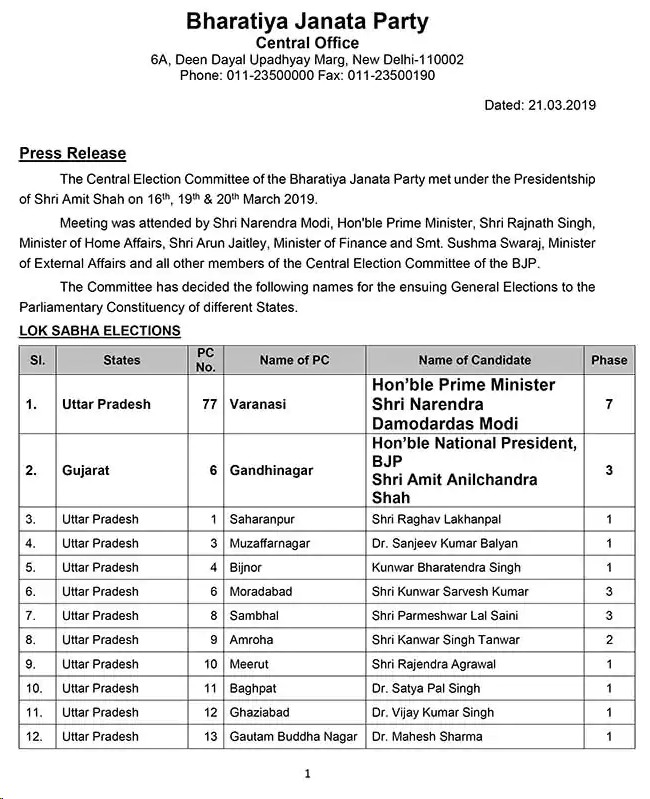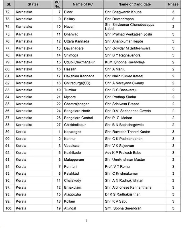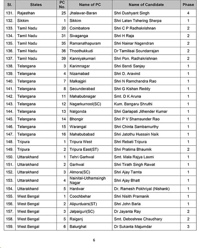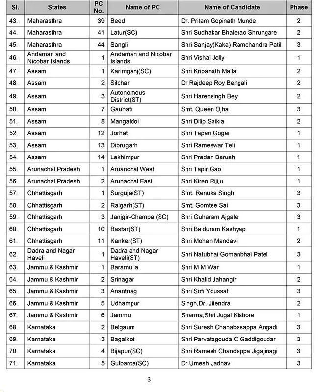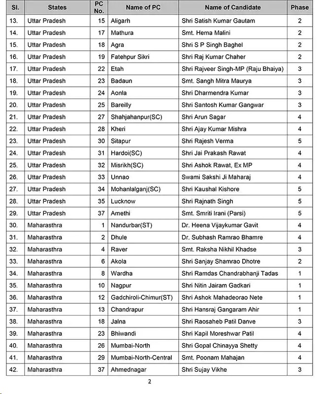 लोकसभा उम्मीदवारों Lok Sabha candidates की सूची में उत्तर प्रदेश के 28, महाराष्ट्र के 16, असम के 8, अरुणाचल प्रदेश के दो, छत्तीसगढ़ के छह, अंडमान निकोबार द्वीप समूह सेे एक,,दादर नगर हवेली के एक., जम्मू कश्मीर के पांच, कर्नाटक के 21, केरल के 13, लक्षद्वीप के एक, मणिपुर के एक, मिजोरम के दो,ओडिशा के दस, राजस्थान के 16, सिक्किम के एक, तमिलनाडु के पांच, तेलंगाना के दस, त्रिपुरा के दो, उत्तराखंड के पांच, आंध्र प्रदेश के 2 और पश्चिम बंगाल के 28 उम्मीदवारों के नाम हैं।