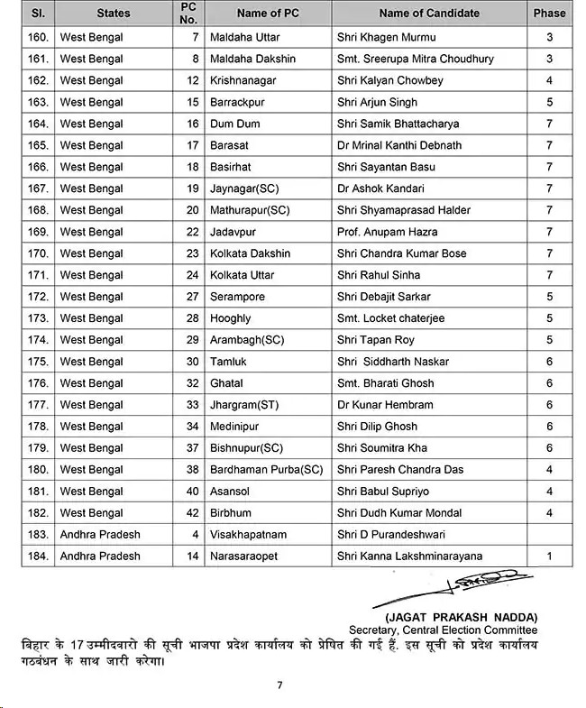 भारतीय जनता पार्टी के लोकसभा उम्मीदवारों Lok Sabha candidates की सूची में 184 उम्मीदवारों के नाम है। उम्मीदवारों की यह सूची केन्द्रीय मंत्री जे पी नड्डा ने मीडिया को जारी की।
