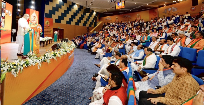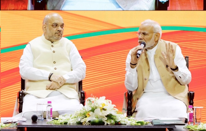Prime Minister, Narendra Modi and BJP National President, Amit Shah addressing concluding session of BJP national executive meeting at Dr. Ambedkar International Centre, 15 Janpath, New Delhi on September 09, 2018.