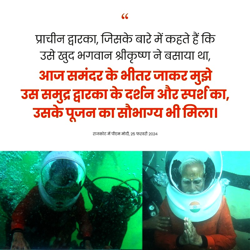 प्रधानमंत्री नरेंद्र मोदी ने आज 25 फरवरी, 2024 को अपनी गुजरात यात्रा के दौरान सोशल मीडिया साइट X एक्स पर पोस्ट में कहा “प्राचीन द्वारका, जिसके बारे में कहते हैं कि उसे खुद भगवान श्रीकृष्ण ने बसाया था, आज समंदर के भीतर जाकर मुझे उस समुद्र द्वारका के दर्शन और स्पर्श का,उसके पूजन का सौभाग्य भी मिला.”