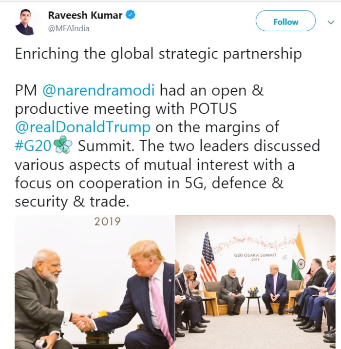 प्रधान मंत्री मोदी ने जापान के ओसाका (Osaka) शहर में शुक्रवार 28 जून,2019 को अमेरिकी राष्ट्रपति डोनाल्ड ट्रम्प के साथ द्विपक्षीय वार्ता की।