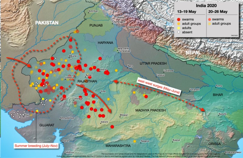 एफएओ के 21 मई, 2020 के लोकस्ट स्टेट्स अपडेट के अनुसार, पूर्वी अफ्रीका में वर्तमान स्थिति बेहद चिंताजनक बनी हुई है जहां यह खाद्य सुरक्षा और आजीविका के लिए एक अभूतपूर्व खतरा बना हुआ है।