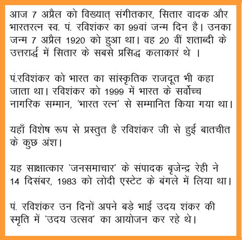 (स्व. पं. रविशंकर Pandit Ravi Shankar जी के 99वें जन्म दिन के अवसर पर आज 7 अप्रैल को प्रस्तुत है बृजेन्द्र रेही से 1983 में हुई बातचीत के कुछ अंश। कला-रसिकों को अनुभव होगा कि उनके विचार आज भी प्रासंगिक हैं।- संपादक)