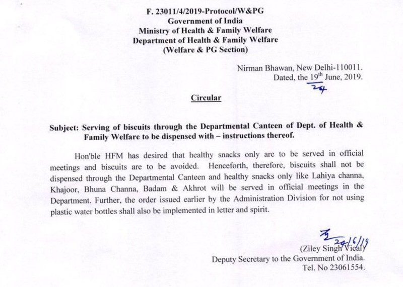 स्वास्थ्य और परिवार कल्याण मंत्रालय की बैठकों में अब से बिस्कुट और प्लास्टिक बोतल में पानी (plastic water bottles) नहीं परोसा जाएगा।