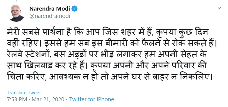प्रधान मंत्री नरेन्द्र मोदी ने एक ट्वीट में नागरिकों से अपील करते हुए कहा है कि मेरी सबसे प्रार्थना है कि आप जिस शहर में हैं, कृपया कुछ दिन वहीं रहिए। इससे हम सब इस बीमारी को फैलने से रोक सकते हैं।