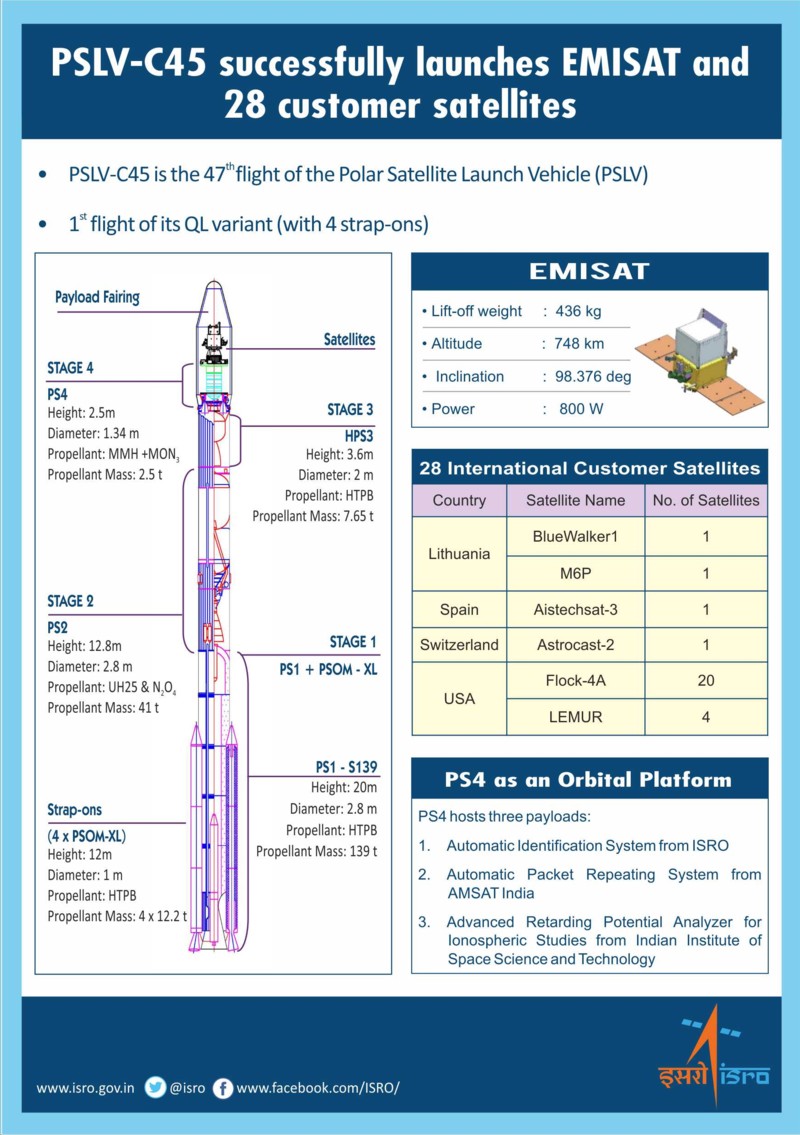 पीएसएलवी-सी 45 PSLV-C45 ने सोमवार 01 अप्रैल, 2019 को श्रीहरिकोटा के सतीश धवन अंतरिक्ष केन्द्र से एमीसैट और अन्य