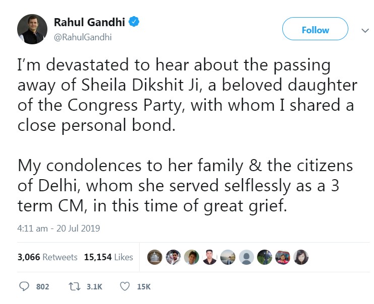 कांग्रेस नेता राहुल गांधी ने कहा कि वह श्रीमती शीला दीक्षित (Sheila Dikshit) की मौत की खबर सुनकर स्तब्ध रह गए हैं और उन्हें गहरा धक्का लगा है।
