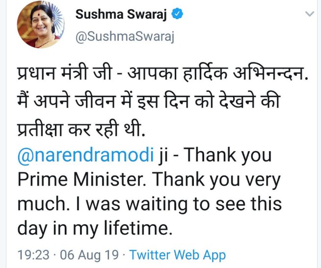 इससे पहले आज शाम को श्रीमती सुषमा स्वराज (Sushma Swaraj ) ने संसद में जम्मू-कश्मीर पुनर्गठन विधेयक के पारित होने के बारे में प्रधानमंत्री नरेंद्र मोदी को बधाई देते हुए ट्वीट किया था।