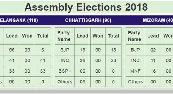 पहले लगभग दो घंटे की मतगणना के परिणामों के अनुसार कांग्रेस राजस्थान, छत्तीसगढ़ में वापसी करती दिखाई दे रही है वहीं मध्य प्रदेश में भी कांग्रेस आगे दिखाई दे रही है। छत्तीसगढ़, मध्य प्रदेश, राजस्थान, तेलंगाना और मिजोरम में विधानसभा चुनावों के लिए वोटों की गिनती शुरू होगई है। मध्य…